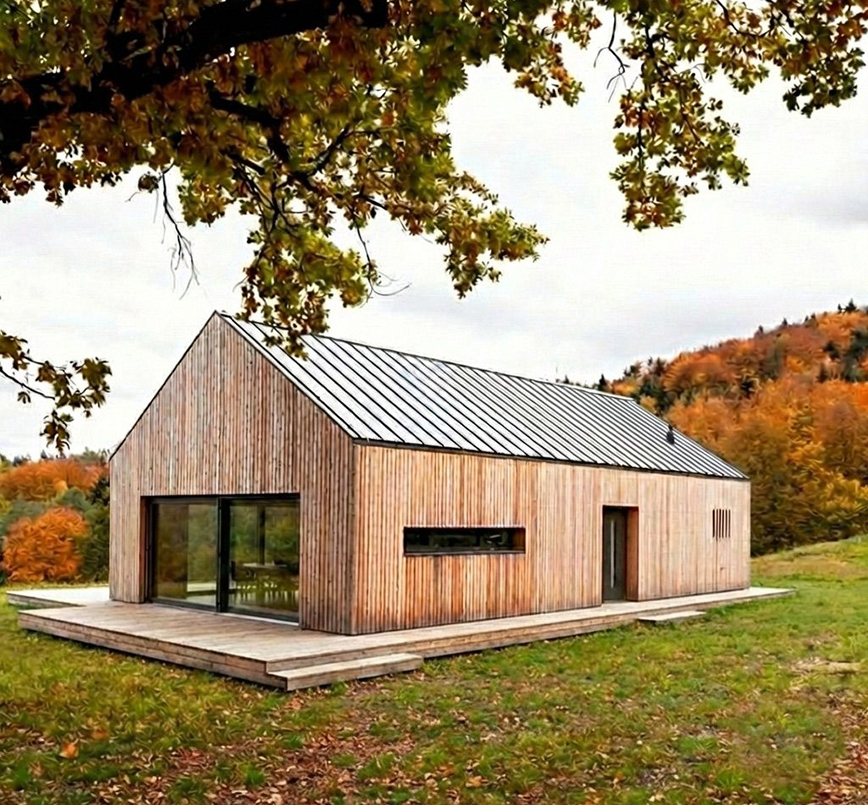 Prosta bryła i drewniana elewacja doskonale wpisują się w naturalne otoczenie, tworząc przytulną i energooszczędną przestrzeń do życia.